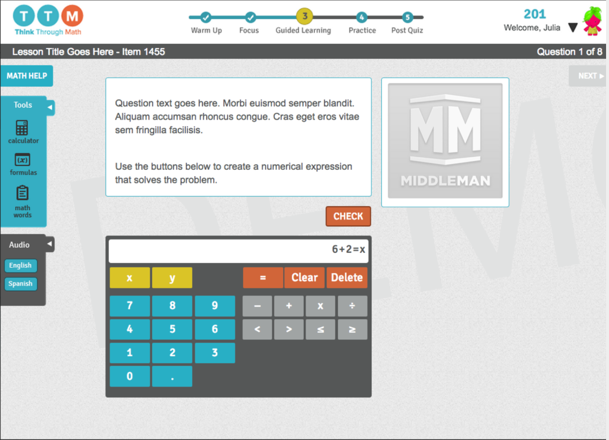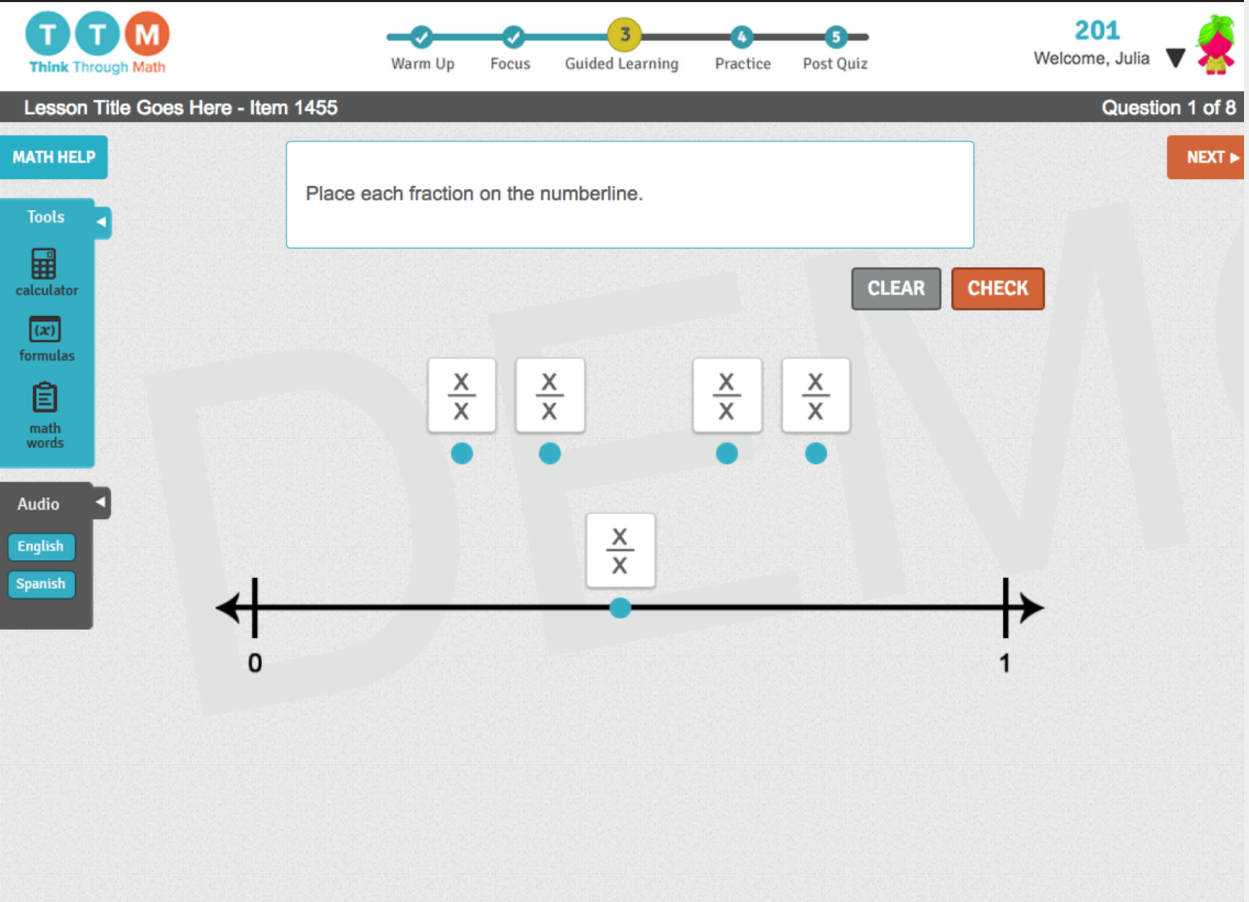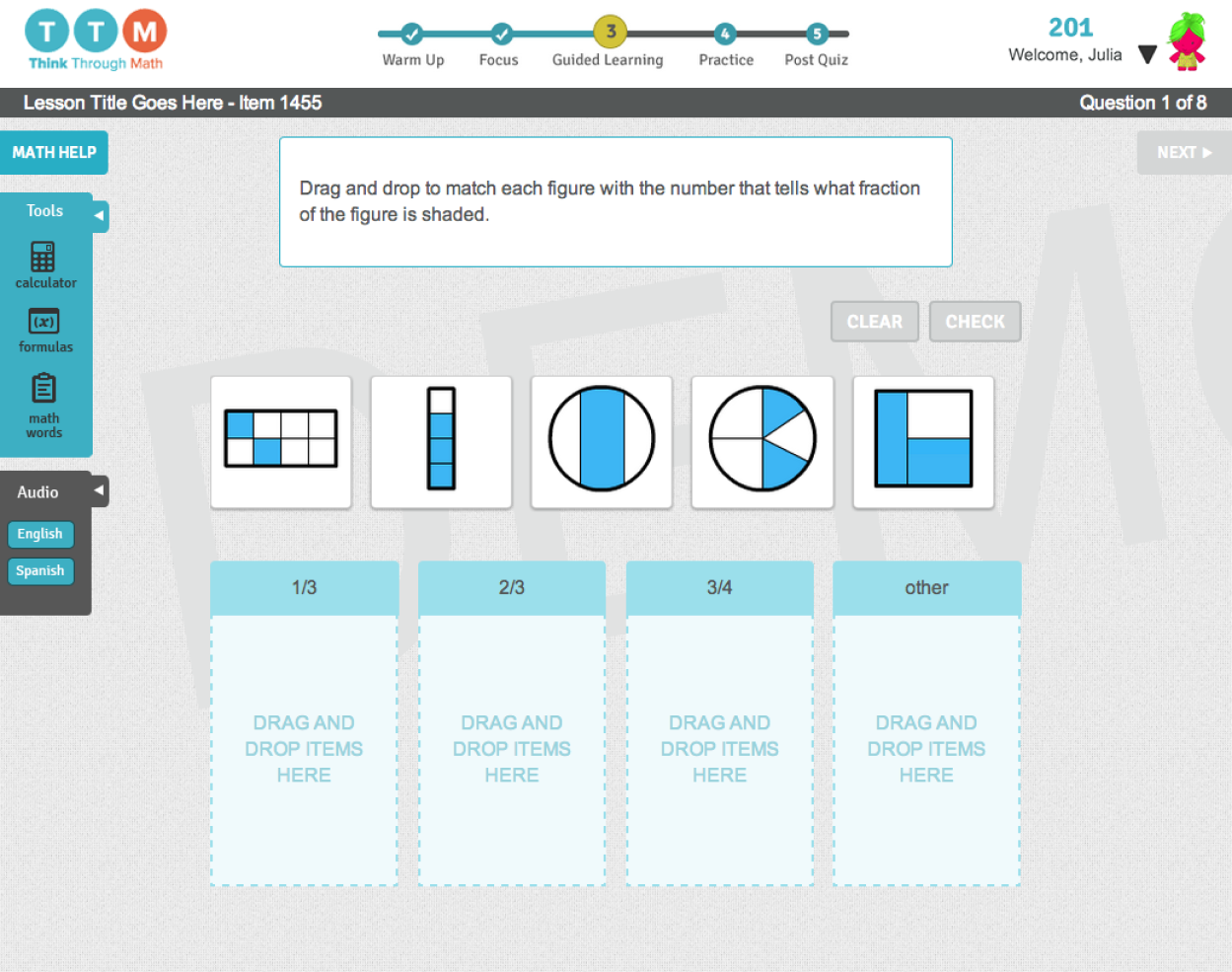 The following are examples from a math learning platform. Interactions included drag and drop to boxes and plot lines and a built-in calculator.
