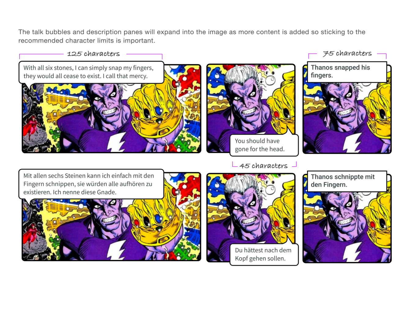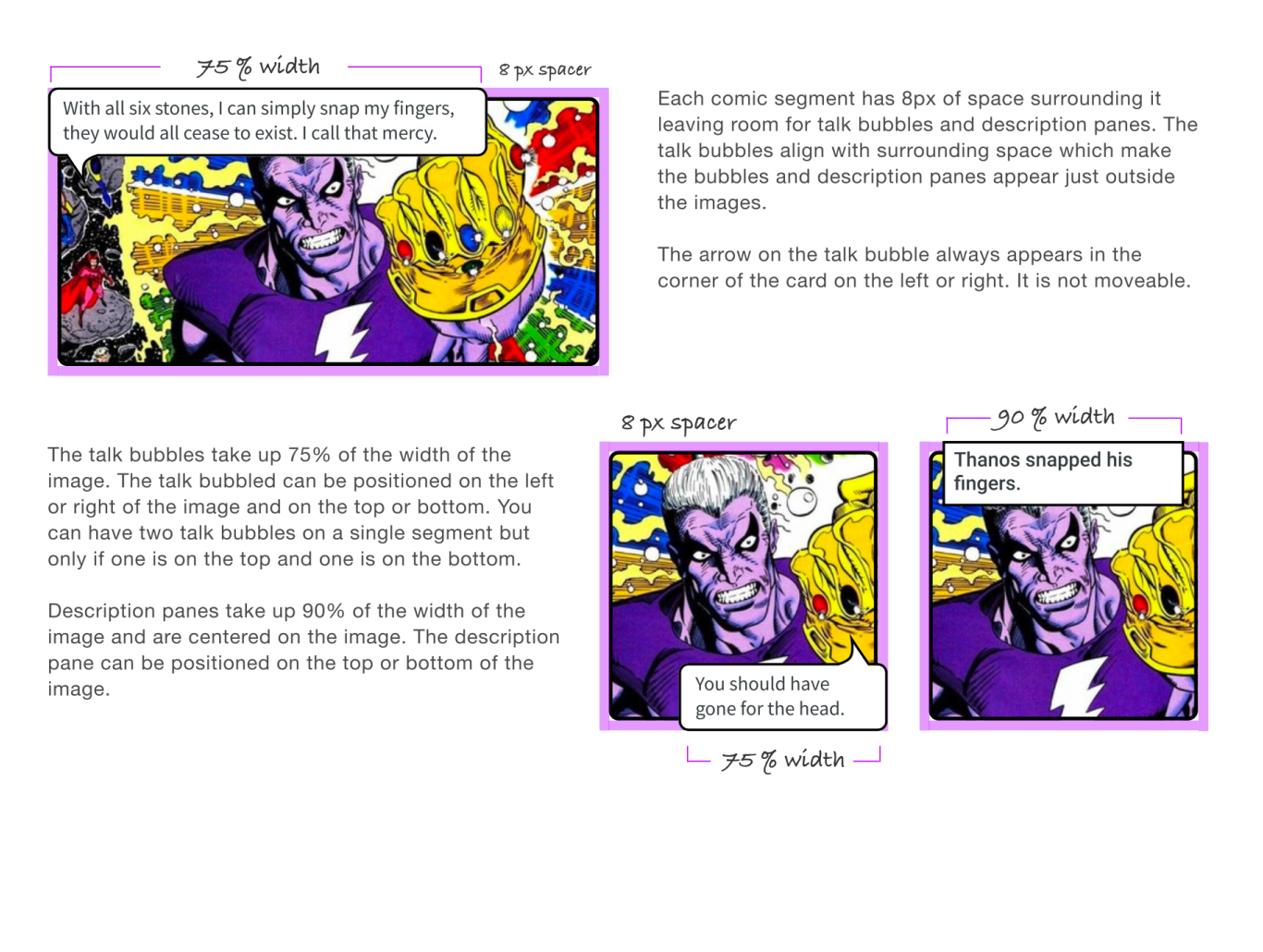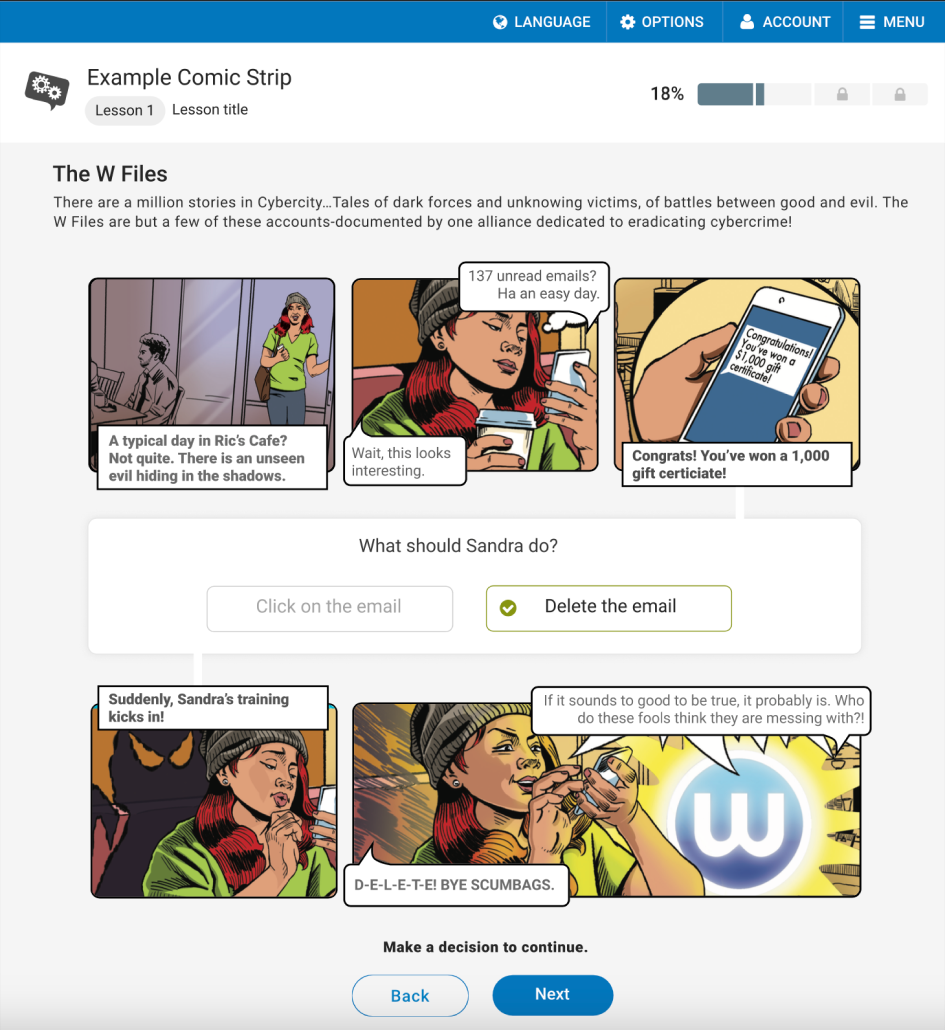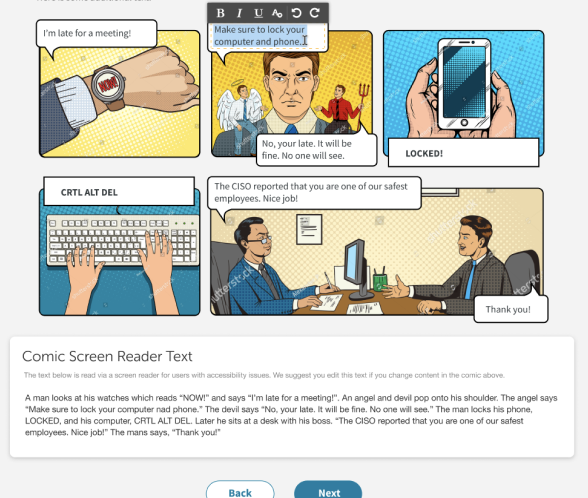 Below is an example of a comic book e-learning. This interaction required the ability to upload images and have them adjust to large and small-sized comic bubbles. Users also needed the ability to add information boxes and talk bubbles at the images' top, bottom, and sides. This pattern is required to accommodate localization and accessibility. I added an option to customize the alt text for a better screen reader experience and to adjust the design for right-to-left locales.
