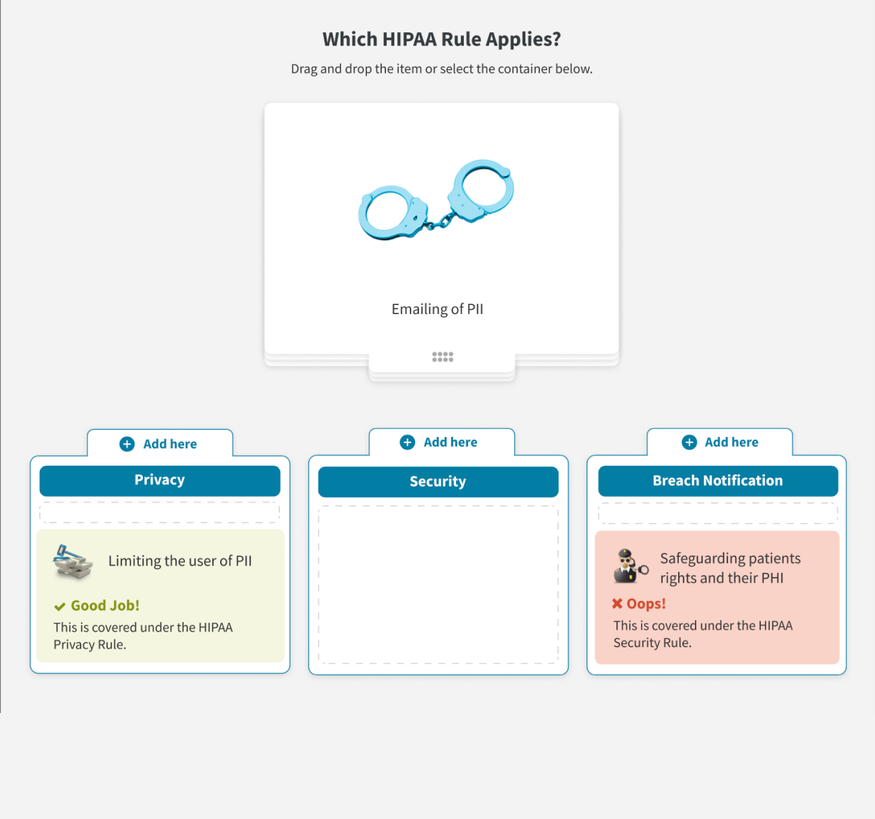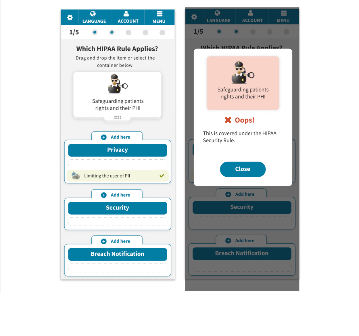 The below drag-and-drop example required feedback to appear upon dropping the item. I also needed to ensure the experience worked effectively on a mobile device.