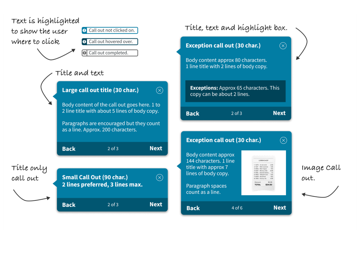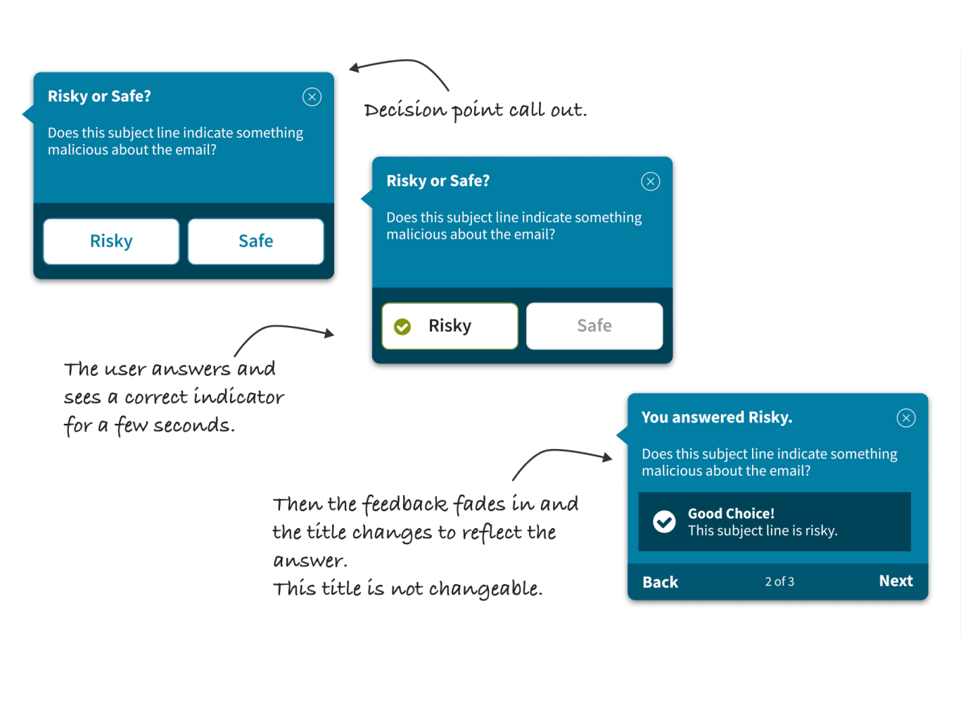 Below is an example of an interactive e-learning. I needed to account for a large image with marker placement for this pattern. The markers required opening pop-ups with various interactions, including quiz questions.